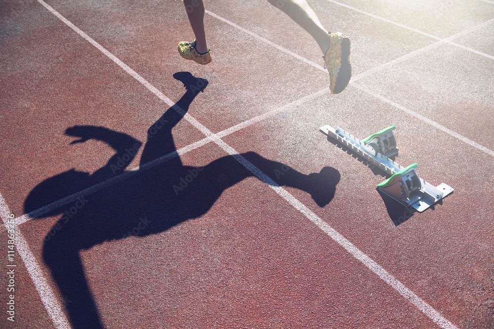 Athlete in gold shoes sprinting from the starting line blocks of a race on a red running track
