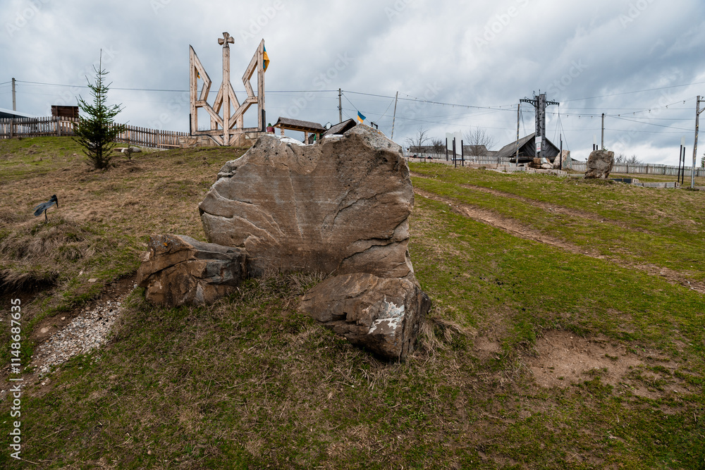 Scenic Landscape Featuring Large Rock Formation and Artistic Structures Against a Cloudy Sky