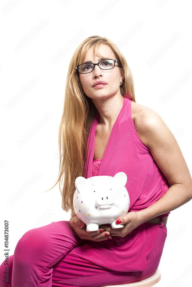 Beautiful blonde business woman with eyeglasses holding piggy ba