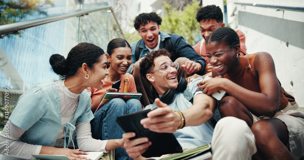 Students, laughing and tech on stairs at campus, wow and share meme with diversity from low angle at university. Group, friends and happy on steps with phone, tablet or comic video on app at college