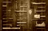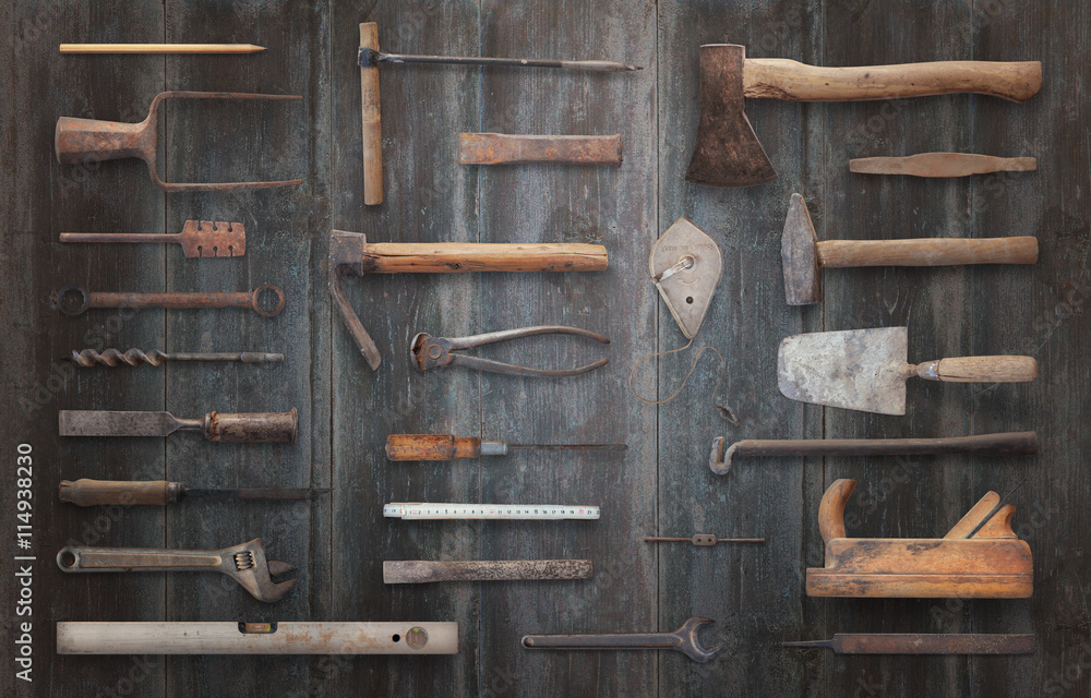 Old tools on wooden table. Traditional handmade tools for craftsmen.