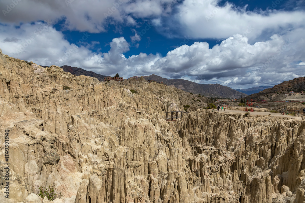 Beautiful stone mountains and valley. Rocks made of stone. Blue sky with clouds.