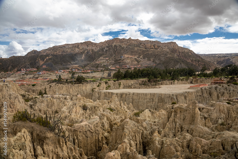 Beautiful stone mountains and valley. Rocks made of stone. Blue sky with clouds.
