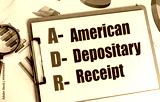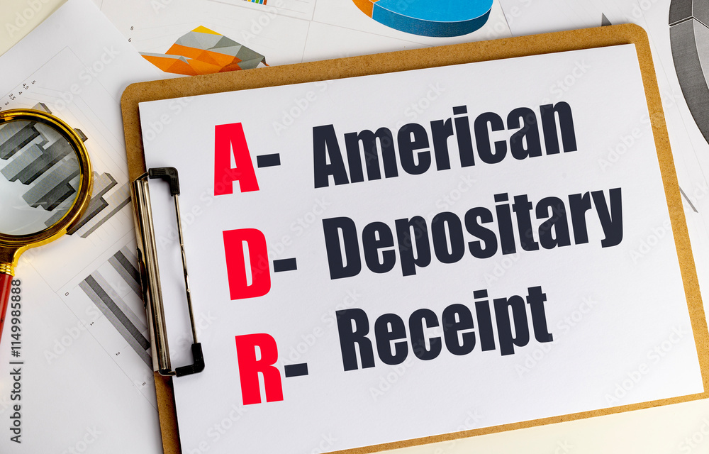 Clipboard with acronym ADR and its meaning american depositary receipt, magnifying glass, and charts on a desk