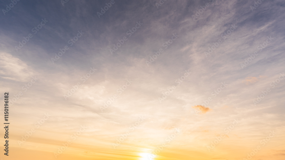 Sunset sky cloud background, Evening dramatic golden hour sky clouds with Orange, Yellow, Blue sunlight in summer season or Horizon morning sunrise sky and beautiful gold nature sweet sunshine