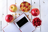 Healthy food concept: cereal berries and apple on a wooden table