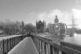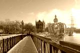 Golden crown ornament on skeppsbron bridge to skeppsholmen island bridge in central Stockholm, Sweden in winter with snow on the ground on a sunny day