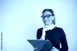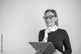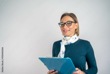 Photo of gorgeous blond secretary woman with short hair writing down notes in clipboard while working in office.
