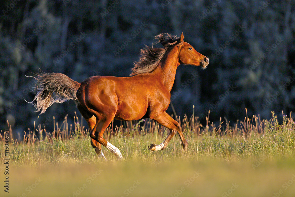 Young Bay Arabian Horse galloping over meadow in late afternoon sunlight