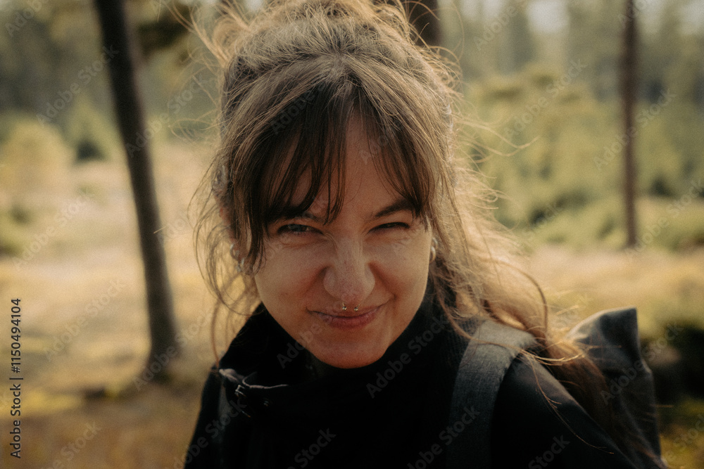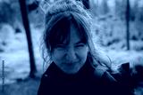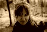 A womans portrait with green trees in the background