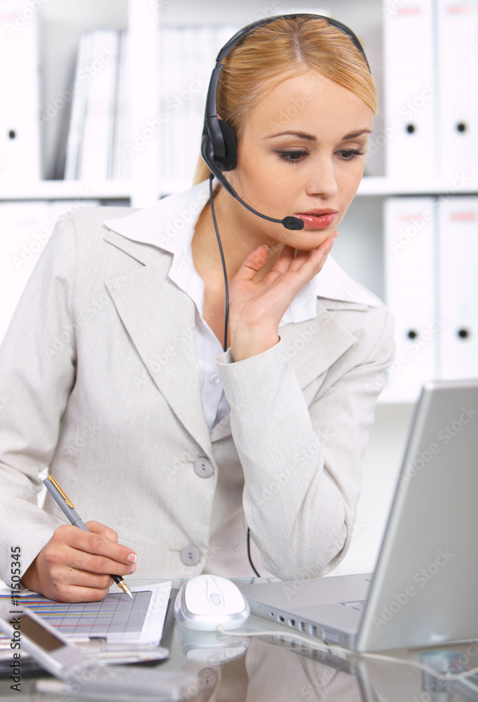 Blond business woman working in office, wearing headset
