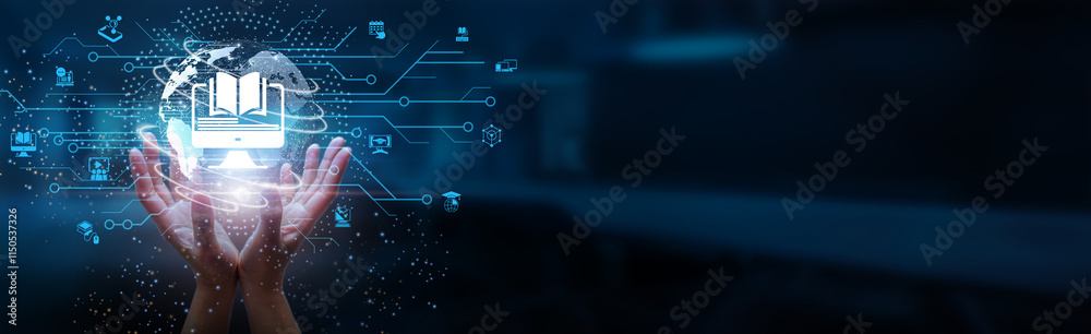 Hands holding globe with network connecting data of E-learning platforms, online courses, and virtual classrooms, global learners, educational content, knowledge sharing, and remote collaboration.