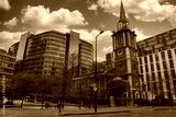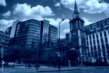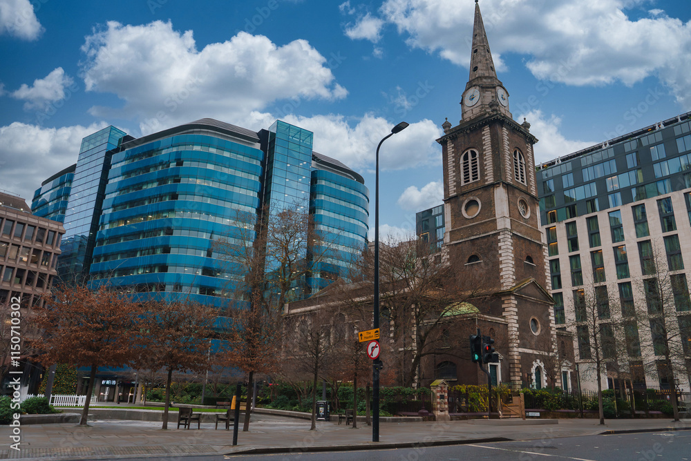 A traditional church with a tall spire and clock stands amidst modern glass buildings in London. Bare trees line the street under a clear sky with clouds.