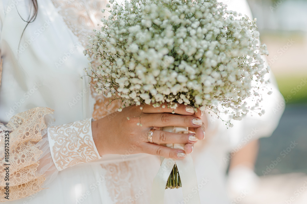 Elegant Bride Holding Delicate Baby's Breath Bouquet
