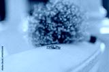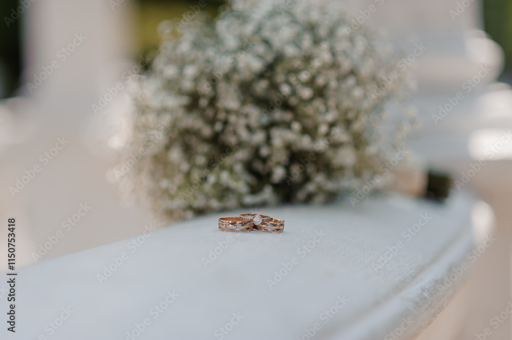 Elegant Wedding Rings on a White Rail with a Bouquet in the Background