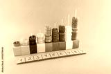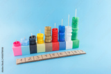 Colorful bottle cap stacks on blocks, educational counting activity, kids learning numbers, bright bottle caps, colorful craft project, DIY educational tools, vibrant educational materials, math game,