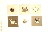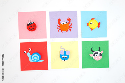 DIY plastic bottle caps for crafts and art project, colored paper on a white background. Flat lay composition with fish, cow, ladybug, mouse, crab, and snail designs. DIY activity, recycling concept,