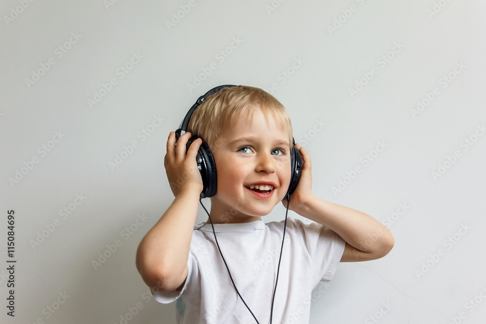 Happy cheerful boy with headphones listening to music on a white
