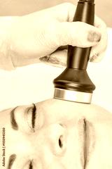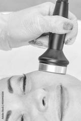 Caucasian female receiving facial treatment with ultrasound device in spa setting.