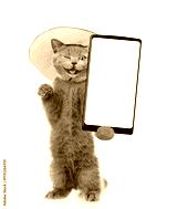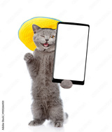 Winking cat wearing summer hat standing on hind legs and showing big smartphone with white blank screen. Empty space for text. isolated on white background