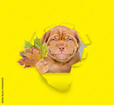 Smiling Mastiff puppy holds dry leaves and looks through the hole in yellow paper