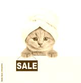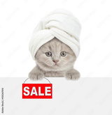 Cute tiny kitten wearing towel on it head shows signboard with labeled "sale" above blank white banner. isolated on white background