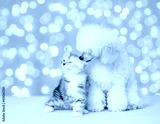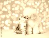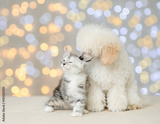 Playful Poodle puppy playing with maine coon kitten on festive background