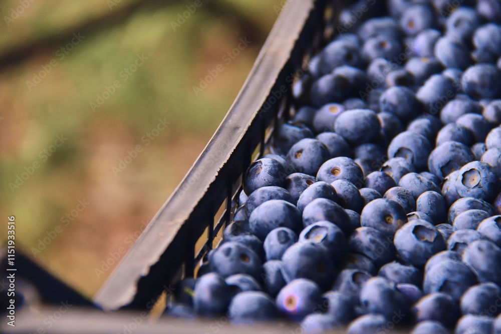 Freshly picked organic blueberries in fruit crates prepared for selling on a market.