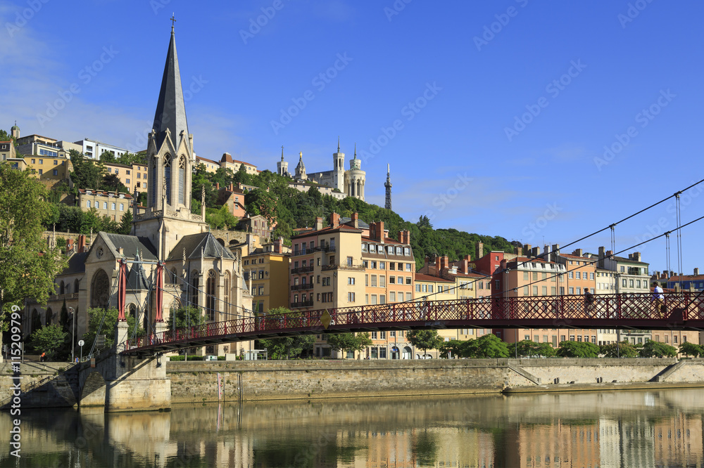 Pedestrians on the Saint Georges footbridge and the Saint Georges church in Lyon, France.