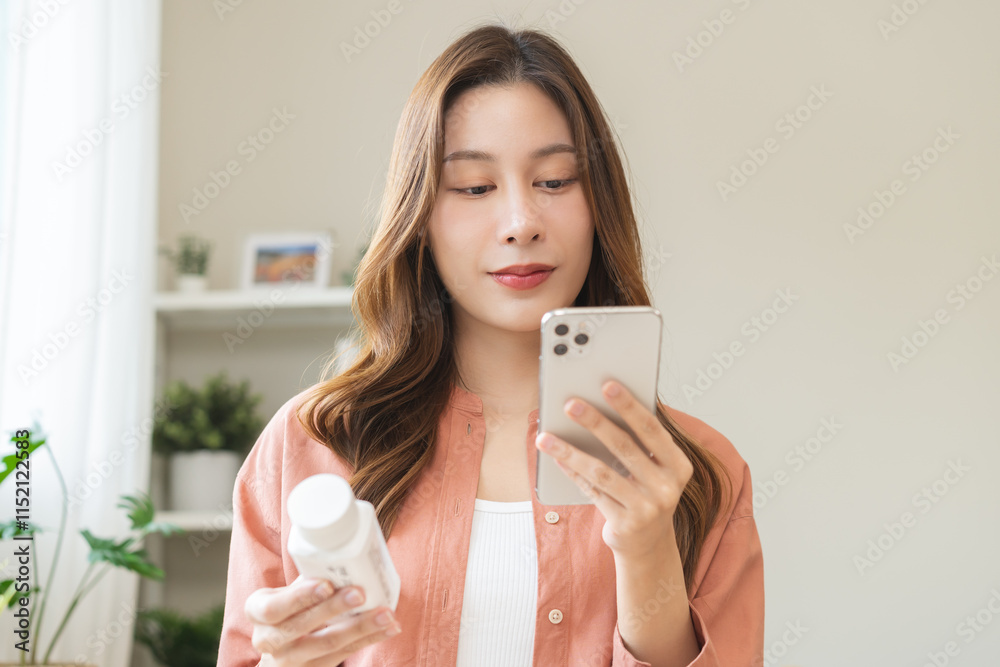 Health care asian young woman using smart phone for reading, searching prescription on bottle medicine, pill label text about information online, instructions side effects, pharmacy medicament concept