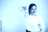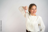 Cheerful woman giving thumb down discussing something on isolated copy space. Message advertisement on an isolated background