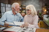 Senior couple sit at a wooden table and look family photos album