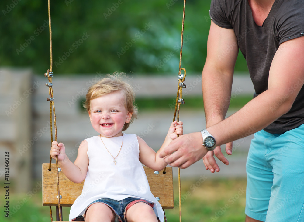 Father with his adorable baby daughter playing swing in the garden.