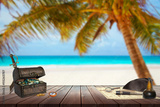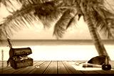 Pirate table with treasure, map, rum, compass, knife. Palm tree, beach and sea in background.