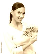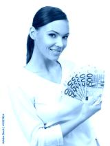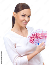 Portrait of a nice looking woman holding bunch of banknotes