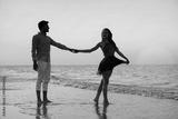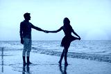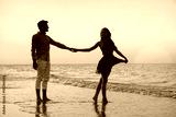 Silhouette of young couple walking at sunset on the beach - Happy lovers holding hands at night by the ocean with big red sun background - Iconic concept of love and tropical holidays with warm colors