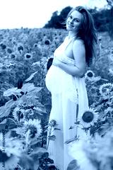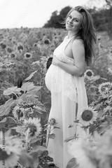 Pregnant happy girl in sunflowers field