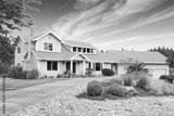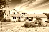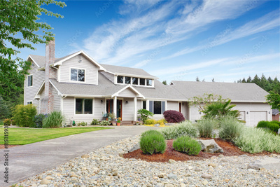 Large beige house with white trim, and well kept lawn