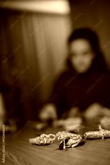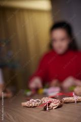 Christmas gifts on table and woman wrapping Christmas gifts at background, focus on gifts