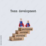 Team development stages. Teamwork concept image with superhero characters on top of the wooden staircase. Words: physiological, safety, love belonging, esteem, self-actualization.