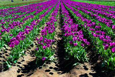 Symmetrical Rows of Blooming Purple Tulips