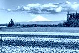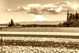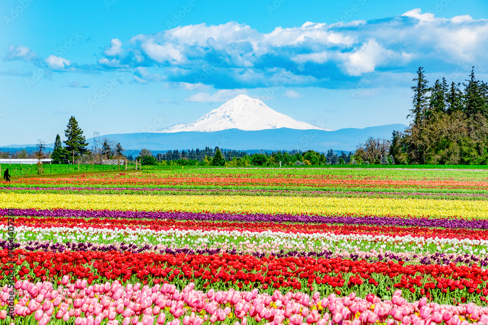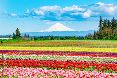 Mt. Hood View in Woodburn, OR With Colorful Tulip Fields in Spring Bloom