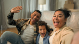 Happy cheerful African American family funny joyful parents mom dad little son boy child kid smile talk video call record live blog on mobile phone camera at new home moving day celebrate relocation