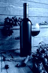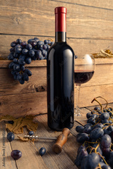 Bottle and glass of red wine with blue grapes on a wooden table.