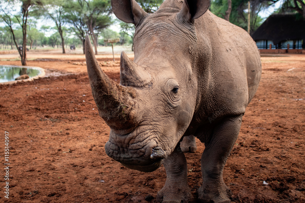 Wild african animals. Portrait of a white Rhino grazing in a National park