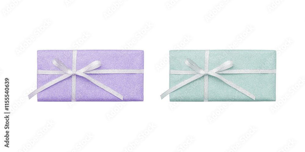 Clipped photo of lame pale purple and pale blue-green gift box with silver lame ribbon