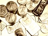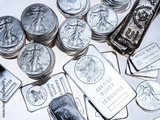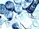 Overhead view of silver coins and bars on white background