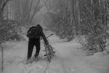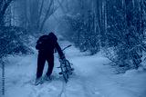A person is pulling a bicycle through the snow