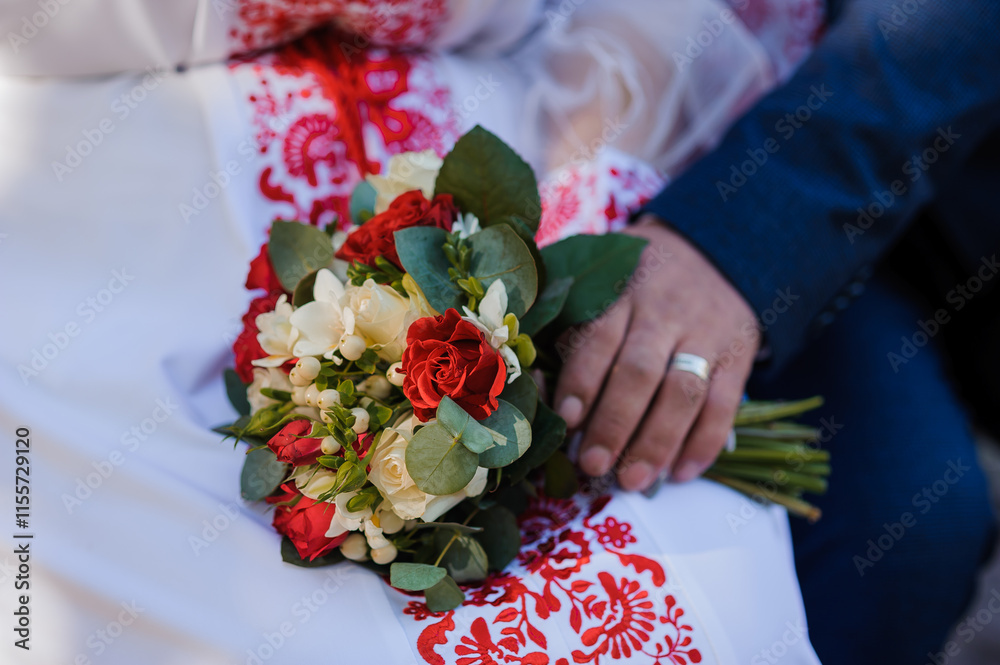 A Beautiful Wedding Bouquet with Red and White Flowers on a Traditional Bridal Dress