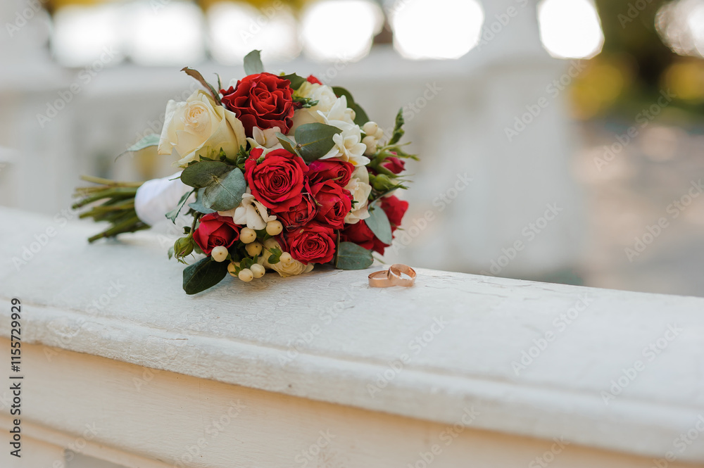 Elegant Wedding Bouquet with Rings on a Rustic Surface